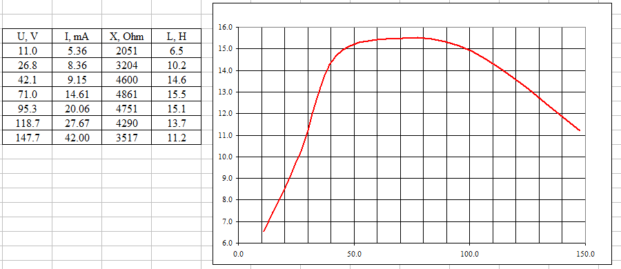 На полной мощности (напряжение на обмотке 118 Вольт, это 0 дБ) индуктивность равна 13,7 Гн.