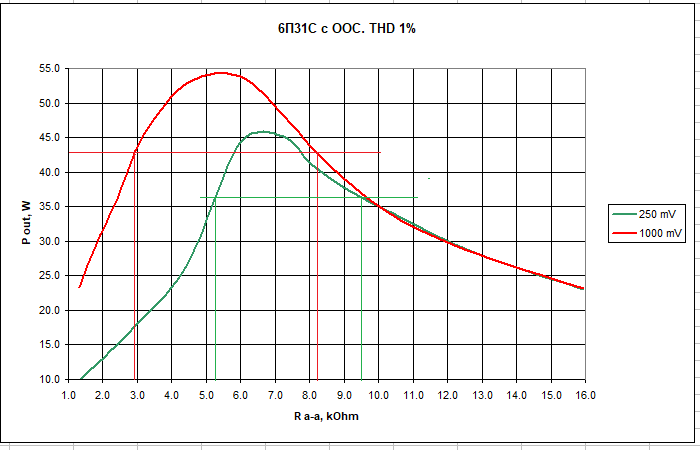 Отмечены области, где мощность спадает на 1 дБ, при изменении нагрузки. При чувствительности в 1 Вольт отношение максимальной и минимальной нагрузок 2.8. Для 250 мВ, 1.8. Естественно, выходное сопротивление в первом случае тоже будет меньше. Так что польза от более высокого уровня чувствительности вполне очевидна. И, в зависимости от выбранного уровня при проектировании получим два отличающихся по звучанию усилителя, вся разница которых будет только в выходном трансформаторе, поскольку оптимальные R a-a будут заметно разными, 4.9 и 7.1 кОм. И запас по перегрузке, при одной и той же мощности при прослушивании будет разным. А это тоже копеечка в копилку качества.