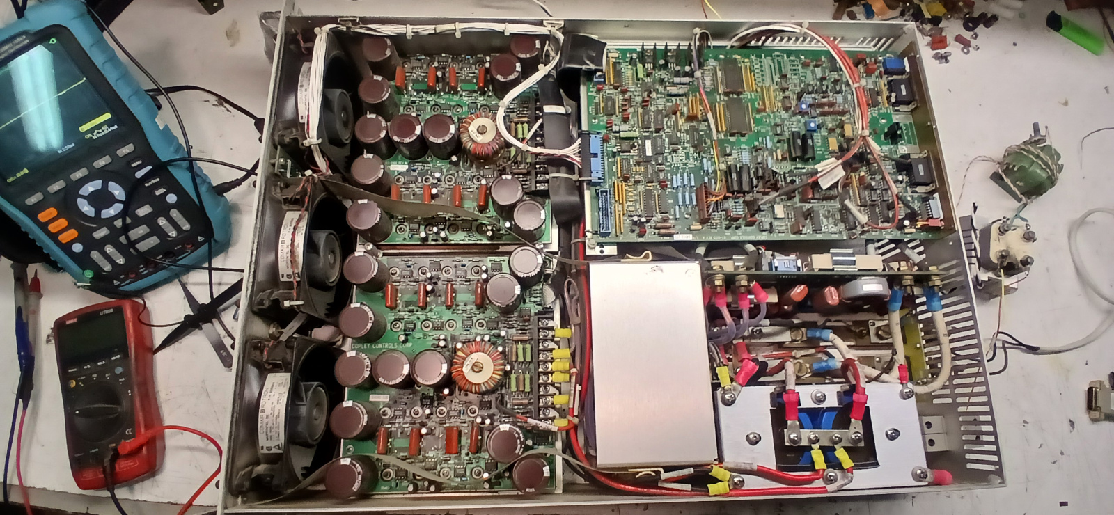 Так вот, для всех нагрузок питание усилителей +/- 100 Вольт. При выборе нагрузки изменяется коэффициент усиления и порог защиты по току. Всё! Питание одно, хоть на 2, хоть на 16 Ом. Это, как ШИМ стабилизатор, на входе 100 Вольт 1 А, на выходе 5 Вольт 18 А. Принцип тот же.